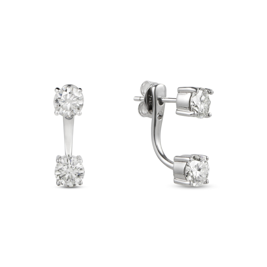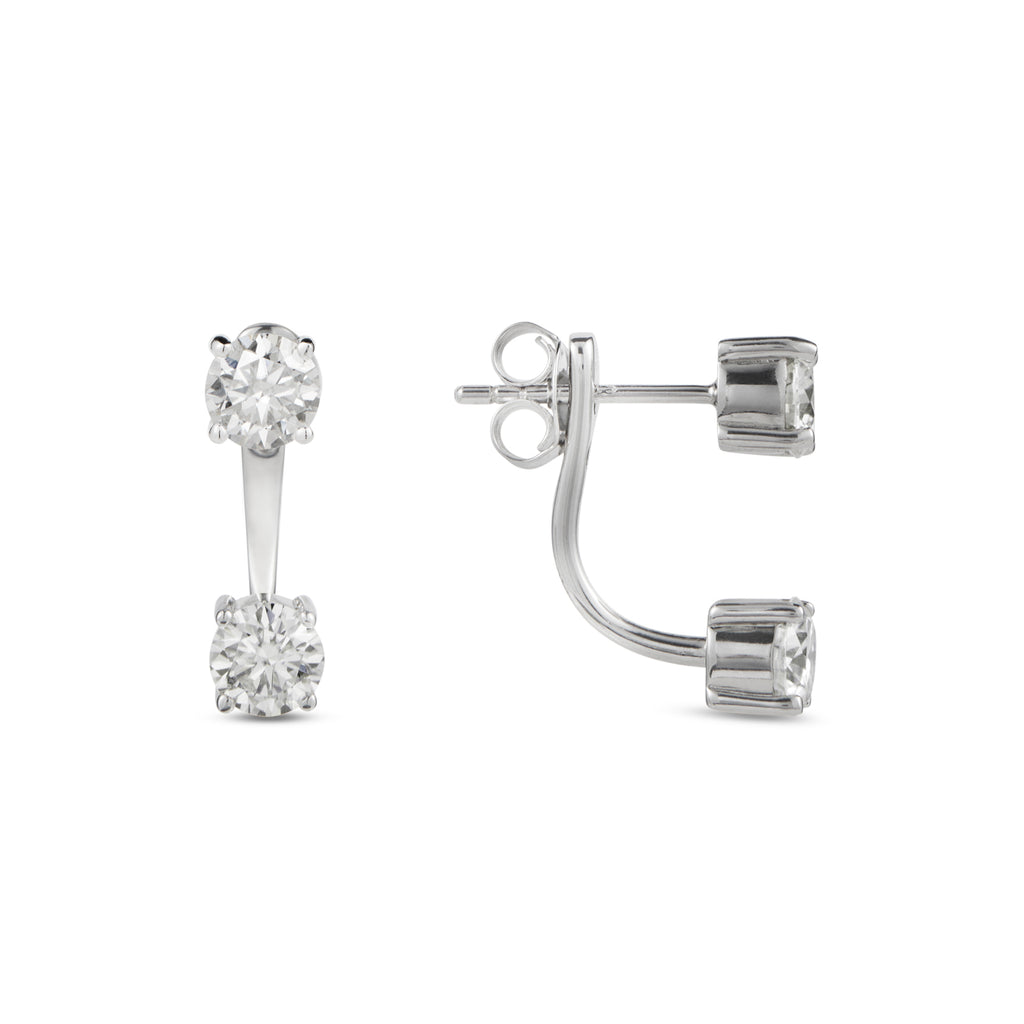 The Nova earrings showcase a modern dual-stone design, featuring moissanite gemstones with a total weight of 1.7 carats in DEF-color brilliance. Each earring pairs two round stones in a vertical arrangement, joined by a sleek rhodium-plated setting that emphasizes clean lines and contemporary style. The symmetry of the design highlights the gemstones’ clarity while creating an elongated silhouette that flatters and catches the light with ease. The detachable lower gemstone allows the earrings to be worn as simple studs, offering versatility for both refined minimalism and full statement sparkle. Elegant yet distinctive, the Nova earrings bring a fresh take on classic sparkle, perfect for both everyday wear and special occasions.