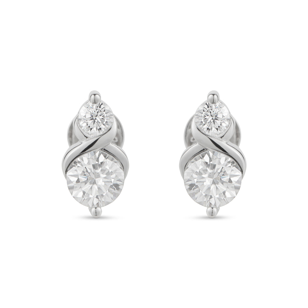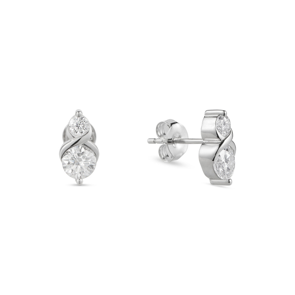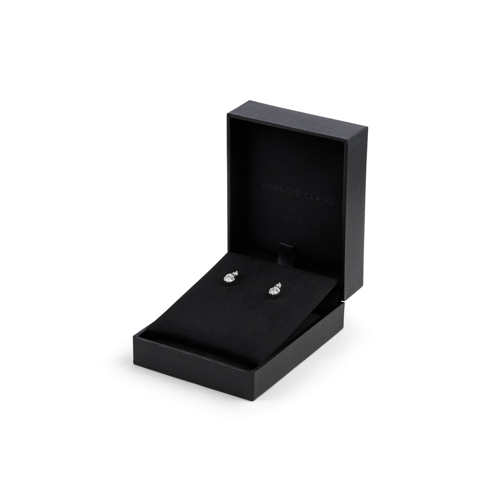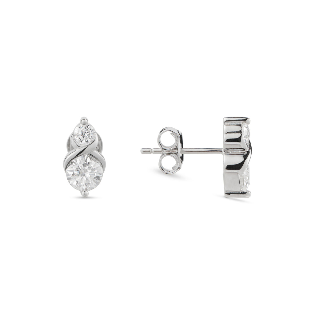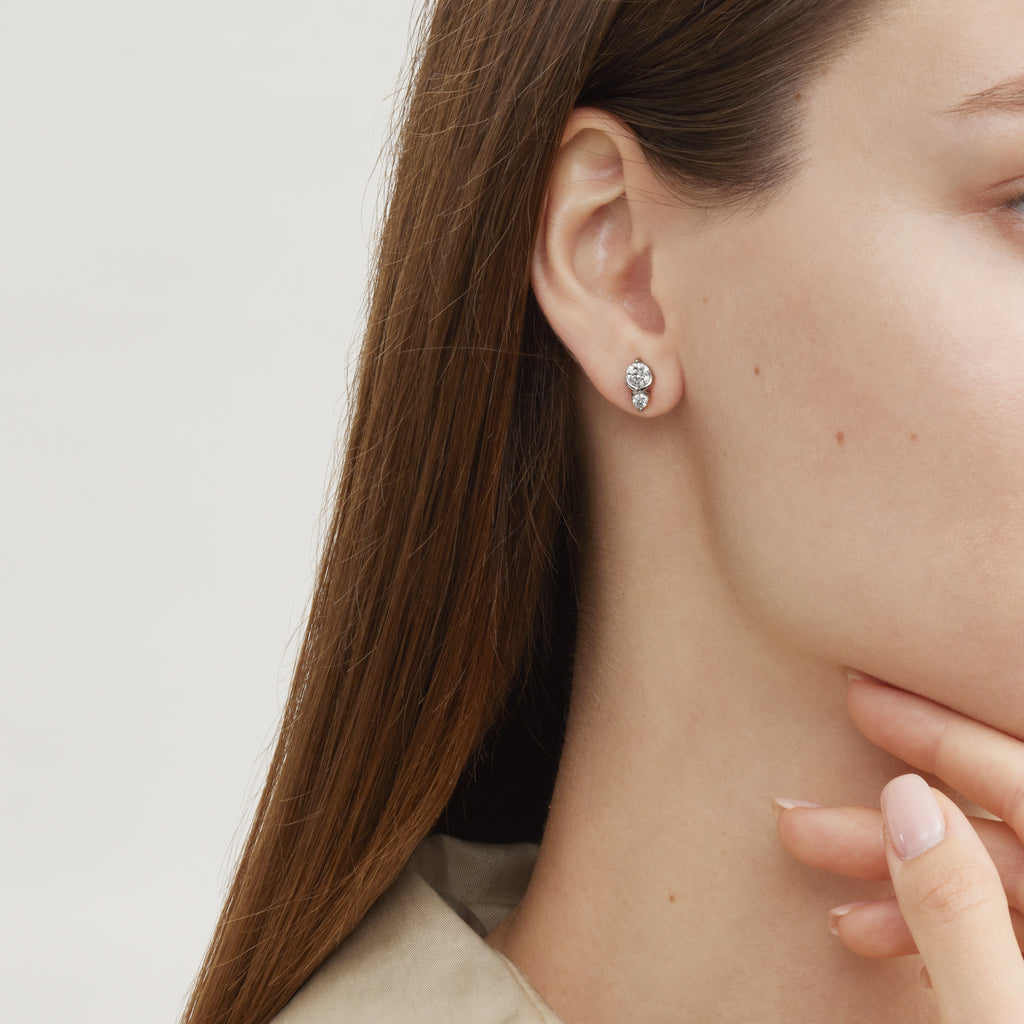 The Zara earrings bring together elegance and artistry in a design that feels both modern and timeless. Featuring moissanite gemstones with a total weight of 1 carat in DEF-color brilliance, each earring pairs a larger stone with a smaller companion, joined by a polished curve of rhodium plating that creates a flowing, sculptural effect. The interplay of form and sparkle gives these studs a refined sense of movement, making them stand out while remaining versatile. Distinct yet effortlessly wearable, the Zara earrings add a touch of sophistication to everyday style and special moments alike.