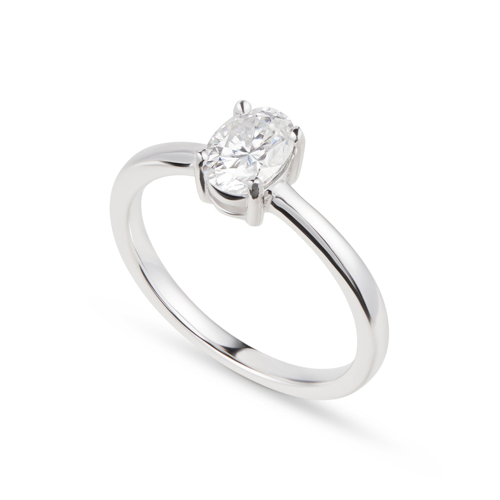 Its centerpiece, a 0.85 carat oval moissanite gemstone in DEF color, draws the eye with its graceful proportions and luminous clarity. The stone rests in a sleek four-prong setting that highlights its brilliance without distraction, allowing its natural radiance to shine through. A polished rhodium-plated band completes the design, its smooth curves offering both strength and subtle sophistication.